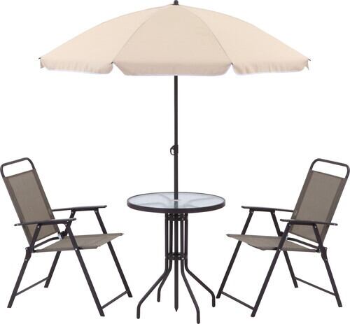 テーブル、チェアー2脚、パラソルがついたガーデン4点セットです。