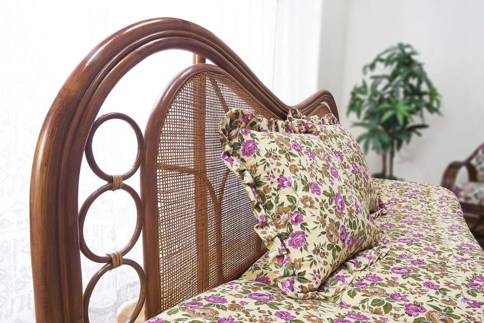 便利な同柄クッション2個付き、天然籐ハイバックカウチソファ。