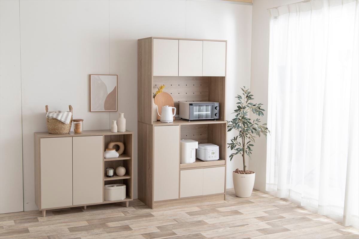 美しい木目と清潔感あるホワイトのバイカラーが印象的な『Erin(エリン)』シリーズのバイカラーキッチン収納